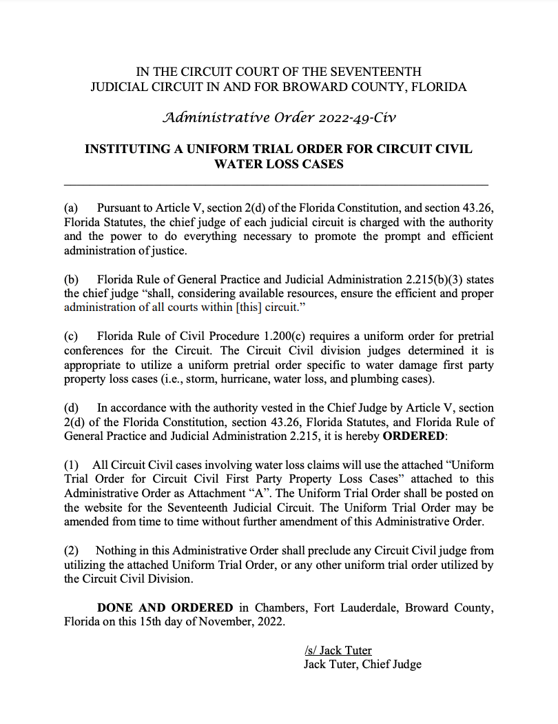 NEW PROCEDURES FOR WATER CLAIMS CASES IN 17TH JUDICIAL CIRCUIT OF FLORIDIA